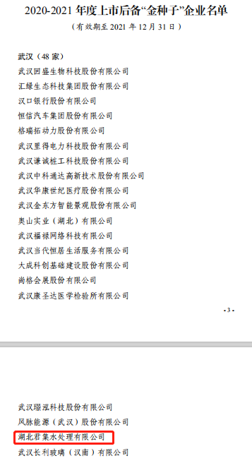 近日,湖北省2020-2021年度上市后备“金种子”“科创板种子”企业名单正式发布。根据《关于印发 2020-2021 年度上市后备“金种子”“科创板种子”企业名单的通知》鄂上市办发〔2020〕6 号文件,经各地推荐、专家评审,征求各地地方金融工作部门及省企业上市工作领导小组成员单位意见,共选定“金种子”企业100 家、“科创板种子”企业53 家,有效期至2021年12 月31 日。其中,湖北明胜m88官网水处理有限公司入选“金种子”企业名录。