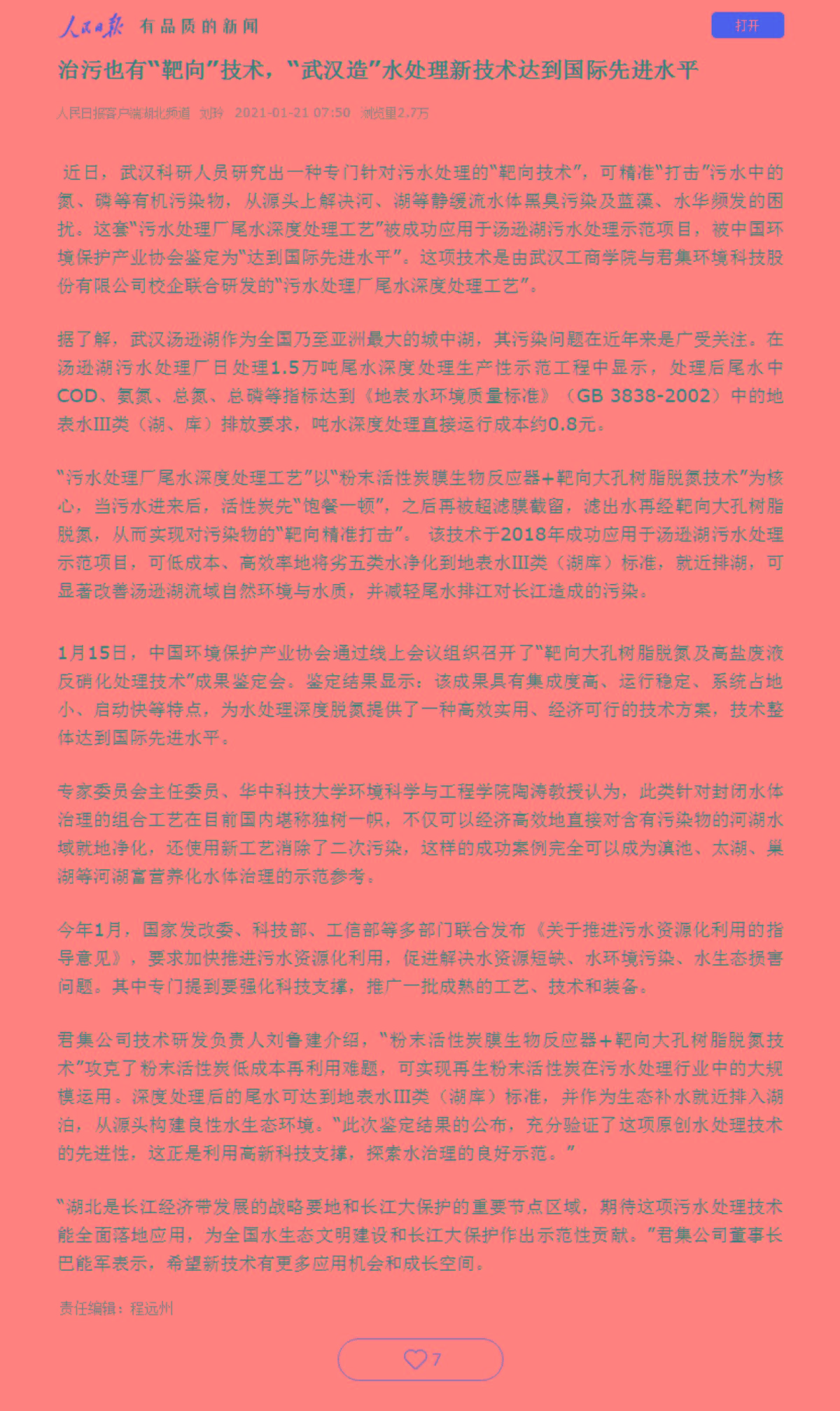 1月15日,由明胜m88官网科技股份有限公司自主研发的“靶向大孔树脂脱氮及高盐废液反硝化处理技术”通过中国环境保护产业协会组织召开的成果鉴定会,并被鉴定为“达到国际先进水平”。
