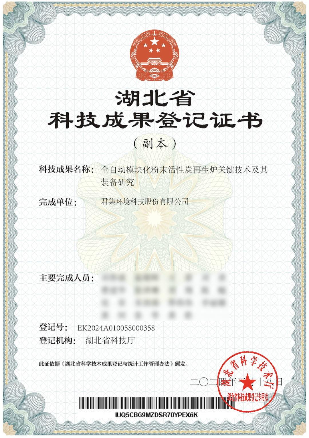 近日,明胜m88官网科技股份有限公司创新研发的《全自动模块化粉末活性炭再生炉关键技术及其装备研究》,荣获由湖北省科技厅颁发的《科技成果登记证书》。